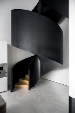 Upon entering the space through a small vestibule, guests encounter a compressed area for storage and seating. The loft then opens up into a vast double-height volume that serves as the focal point of the design with standout features such as the sculptural matte black spiral staircase and bridge, which are both directly inspired by features of the Death Star. These features surround the minimalist, yet incredibly elevated kitchen that is grounded by a white concrete floor. A Pietra gray marble island serves as the primary source of counter space and doubles as a dining table with room for four. Five sleek black Vibia pendants hang above the island to provide more concentrated spotlights for food prep and gathering. The counter seating from Estudio Persona adds a sense of softness to the ultra-modern space.
