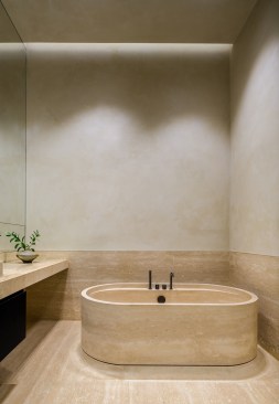 The home office – surrounded by acoustic panelized walls – is personalized with Star Wars figurines on the marble wall-mounted desk and platinum record awards. The main bathroom is sculpted from a single beige travertine surface, with curved lines that recur throughout the home.