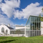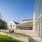 The new facility leverages the campus’s dramatic topography to create an architecture that is fully integrated into the landscape. The dance studio and black-box theater form two sculptural hyperbolic paraboloid volumes that are held back from the street and tucked into the hill alongside the historic dance barn. A long glass lobby connects the existing dance center to the new studio and black box theater through a single light-filled gallery space, providing an accessible campus route that negotiates the steep 12’ grade change. This lobby opens into a large lower courtyard that is intended to host public performances and into an intimate upper courtyard that offers a richly planted space for small gatherings. Together, these courtyards extend the opportunity for arts to spill onto the campus, and they invite students of all disciplines to share in arts making.