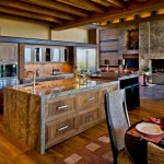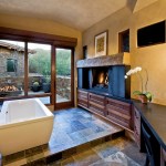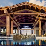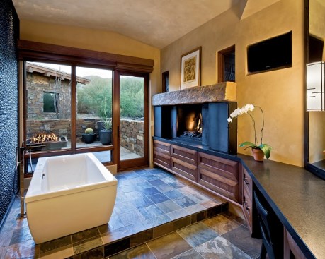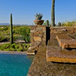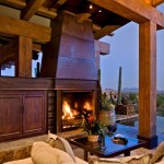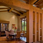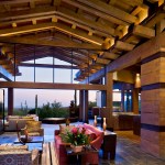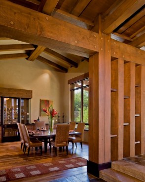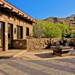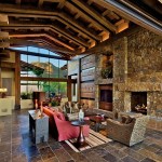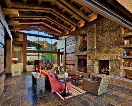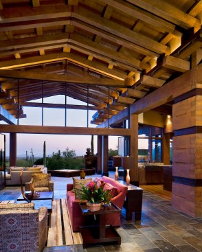 The design features Douglas fir heavy timber trusses that span from the great room into the dining room and kitchen, supported by timber feature walls. The ridge beam of the central great room was aligned to frame spectacular views of the desert mountain ridge, connecting the indoor and outdoor living spaces. The structure extends out to create a northern courtyard for the bedrooms and master suite, which center around a fire pit courtyard that opens to the mountain range. The wood walls throughout were chinked and finished much int he same fashion asa log home serving as both structure and aesthetic elements with unique wood detailing. The grand scale of the main room was grounded with local natural stone and aged steel accents.