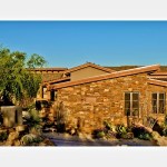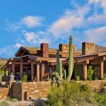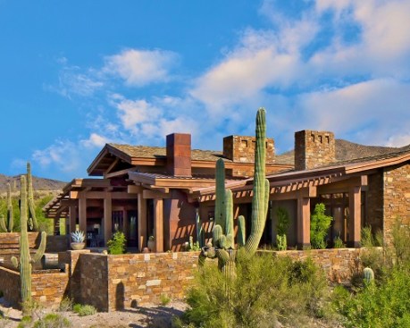 The home incorporates an open floor plan with warm, textural materials, clear span windows, bi-folding doors, and deep covered decks opening to the Sonoran desert vistas, all in a hybrid desert Craftsman style.