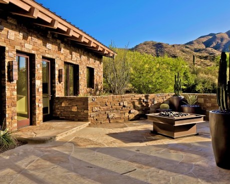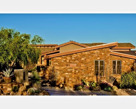 The major design objective was to site the house to take best advantage of the view corridors, from views of the city lights to the desert, to the mountains. Another objective was to use natural materials from the region: native stone, copper and Douglas fir.