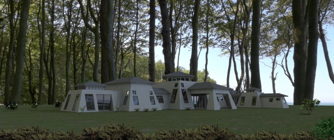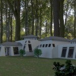 This fairly eclectic one story design features a master suite, plus 2 additional bedrooms, 2 1/2 baths, a large entry, a home office/study and a two car garage with an attached workshop. Because the master suite and other bedrooms are at opposite ends of the residence, there are two laundry areas within the design. The general living spaces are quite spacious with several different ceiling heights, including a 14 foot high ceiling and cupola over the central living, dining and kitchen spaces.