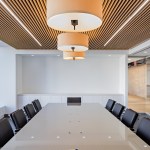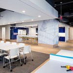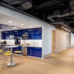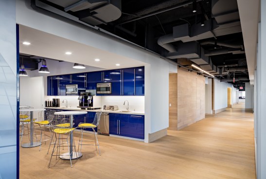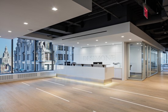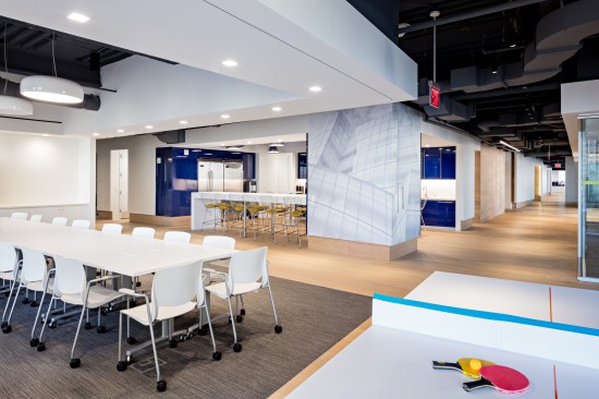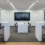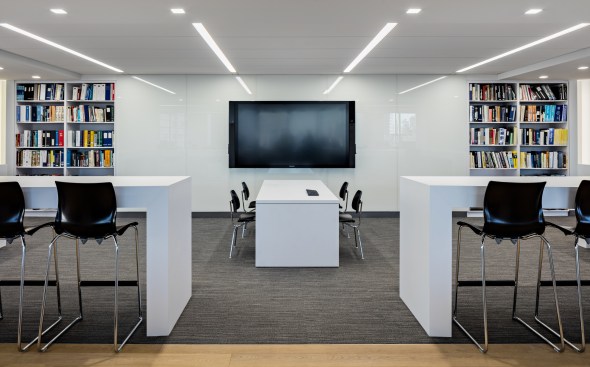 Tasked with creating a contemporary work environment that would facilitate direct communication and collaboration between DeSimone’s international offices, Spector Group designed a sleek professional work setting defined by openness and flexibility. Located on the 25th floor of 140 Broadway, DeSimone’s New York office comprises 26,000-square-feet of office, breakout and social space. The centrally located bistro area serves as the social hub of the office, while the adjacent gaming area, training room and lounge provide additional creative and collaborative spaces for impromptu meetings and gatherings. Glass windows along the perimeter of the space boast spectacular views of the Manhattan skyline, while gallery walls around the core of the office space showcase black and white photographs of DeSimone projects.