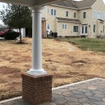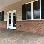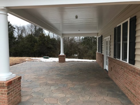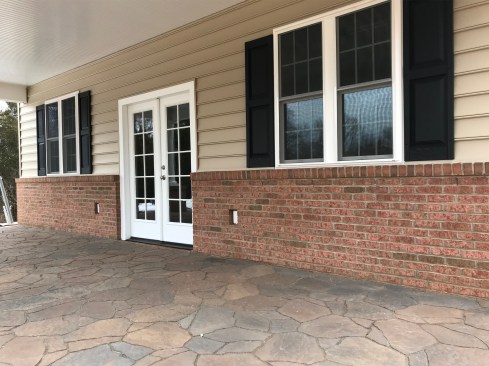 French doors open to the partially covered patio complete with tongue in groove ceiling, decorative columns and flagstone pavers. The brick work detail, arched windows and black shutters mimic the exterior of the main home.