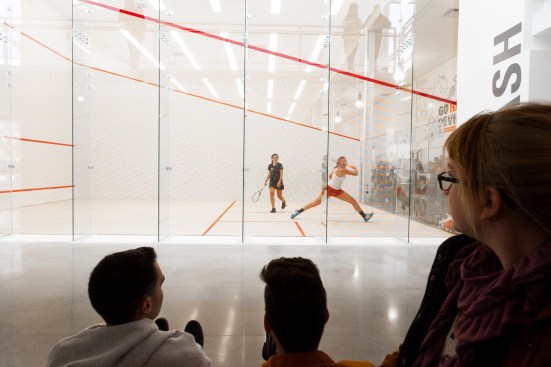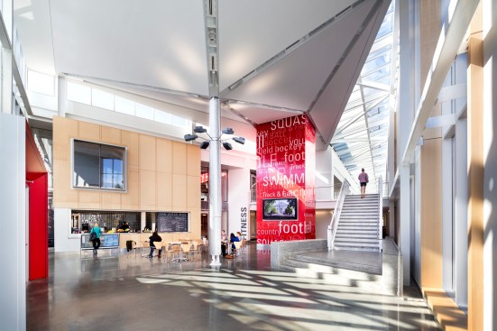 Meant to create campus community space, the entry court is populated with tables and chairs. Directly inside, the new student commons is a sky-lit lobby which starts an organizing concourse that will eventually link all the athletic activities in the new and old Kline Center. The commons contains a small café and an assortment of student study spaces that can be reconfigured for student programs and activities.