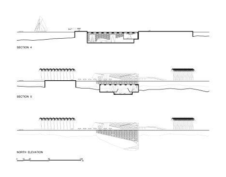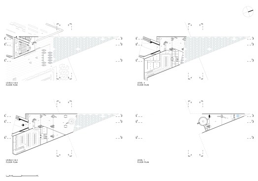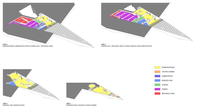 Since seawater temperature is always lower than the ambient temperature, placement of the building underwater allows to minimize energy strain on the mechanical systems used for cooling. Overall organization follows a triangular grid, which defines the main morphological and functional aspects of both building and landscape. This grid organizes the roof cells that are supported by diamond shape structural cores. Required distribution of MEP equipment happens through the cores which also embody the main function of internal circulation. Circulation network is further organized by the pathways of staircases, ramps and lifts that act as connection points between the different levels and guide the visitors through the exhibition levels.