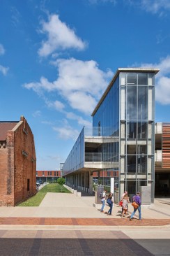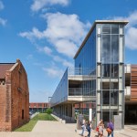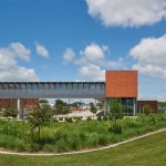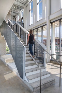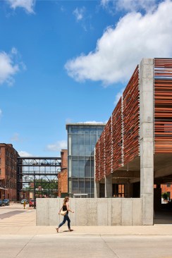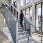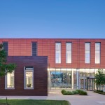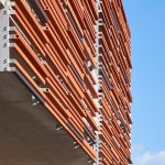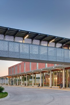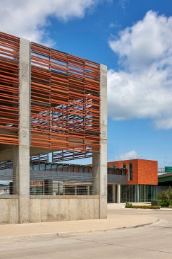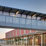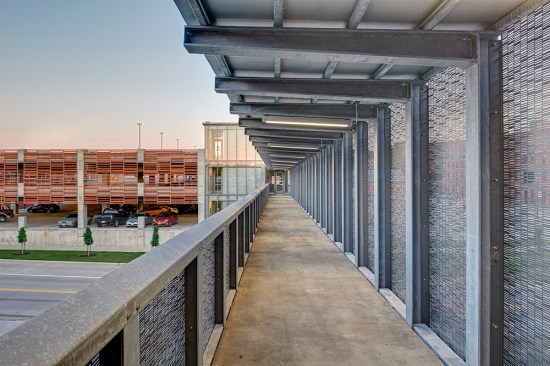 At the post-tensioned concrete Parking Garage, a galvanized steel structure supports the perforated metal panels, and terra cotta baguettes. LED light fixtures throughout utilize daylight harvesting and occupancy sensors.