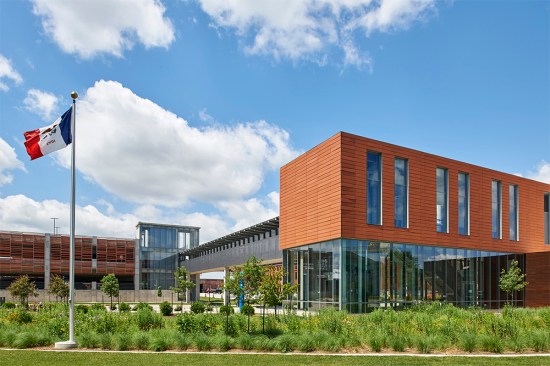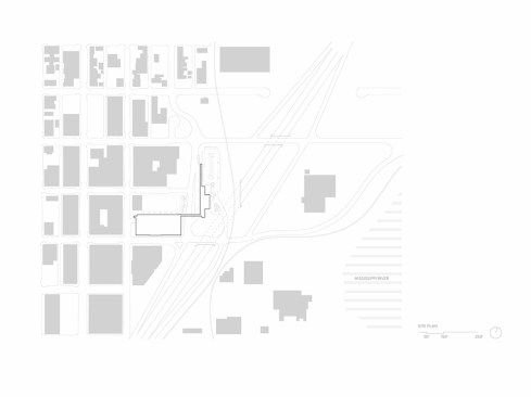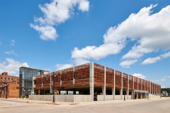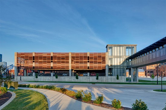 A product of local, state, and federal investment, the transportation center leverages infrastructure to spur regeneration in a historic city district. The campus, sized for future passenger trains to Chicago and Minneapolis and configured to allow expansion, includes three components: a Parking Garage for 292 vehicles, a Raised Walkway, and a Terminal Building with ticketing booths, office space, and restrooms. These carefully arranged elements provide a backdrop to the district, screening it from the adjacent interstate. In crafting this urban edge, the project also primes an adjacent site for future public green space.
