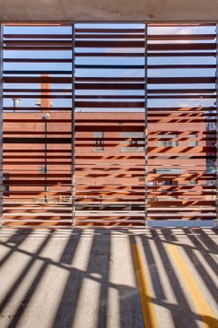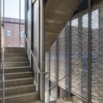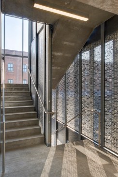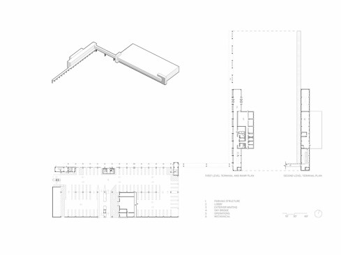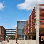 The complex achieves urban impact with contextual sensitivity. Complying with preservation guidelines, the buildings’ scale and proportions reference their historic surroundings. Column and window rhythms echo nearby warehouses. Terracotta is the primary exterior material, complementing the district’s brick construction. Sunscreens cloak the Parking Garage and rain screens clad the Terminal Building, with patterns that also emerge in perforated aluminum along pedestrian circulation.