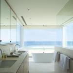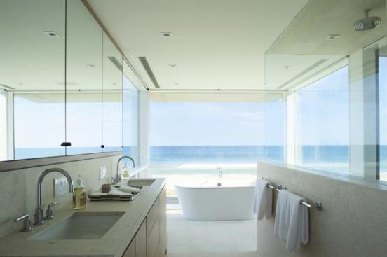 This house is located only steps from the beach in the famed Hamptons, so architect Frederick Stelle made certain to exploit its million-dollar views of the Atlantic Ocean. The master bath juts out from the house and is encased in floor-to-ceiling glass, capturing plenty of natural light along with that panorama. A soaking tub commands the best views, while the shower features a half wall that maintains sightlines but offers a modicum of privacy. The space is outfitted in a rich palette of “carefully Cerused Oak” millwork, Calacatta Gold Marble countertops, and Limestone floors and Shower Tiles.