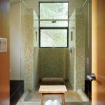 Like its kitchen, the Dutcher Creek Residence’s master bath and powder room carve out distinct spaces without isolating themselves, but here the balance of openness and privacy required even greater subtlety. In the master bath, vertical grain Douglas fir linen cabinets flank the access from the adjacent dressing area, linked by a fir lintel over the doorway. A triangle of glass above opens the room to the dressing area and the bedroom beyond, notes architect Richard Schuh, “so the ceiling can flow through.” Mirrored sink walls outboard of the cabinetry create the illusion of a freestanding gated entry. A walk-in shower anchors the symmetrically ordered plan, its glass-tiled side walls delineating twin, semi-private compartments for a toilet and urinal. The shower’s concrete pan and glass wings extend into the room, forming a transparent “front porch” for toweling off.