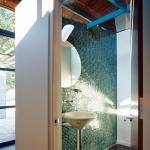 The powder room occupies what first appears to be a plain, windowless box floating in the glass-walled main wing. But this box holds a surprise: a glass ceiling that floods the small space with natural light. A wall of glass mosaic tile adds glitter, and compact circle-themed fixtures and fittings take care of business with minimum fuss.