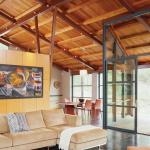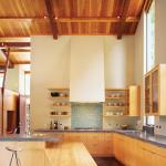 The strength of the Dutcher Creek Residence kitchen lies in creating a coherent sense of place while never losing touch with its surroundings. Open to an adjacent dining area and separated from the living area by only a bank of freestanding cabinets, the space rises to a layered roof structure—exposed steel members topped with Douglas fir purlins and decking—that suggests the shape of the entire house. Architects Amy Nielsen and Richard Schuh oriented the building toward views of a neighboring vineyard and a grove of mature redwoods, locating a roof-high window over the kitchen’s main sink, Schuh points out, “so, as you work in the kitchen, you look up and see the height of these trees.”