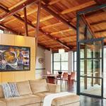 The island constitutes another piece of functional sculpture, its concrete top overhanging a table-height counter of maple butcher block. The lower counter’s form repeats an angle found, in plan, throughout the house; the bracket supporting its long cantilever is steel, like the house’s main structure. The latter—box-section steel members finished in a red inspired by the original primer color—serves as electrical chases for the kitchen’s overhead lighting, for which the architects sourced fixtures that snap neatly into holes drilled in the steel rafters.