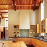 The strength of the Dutcher Creek Residence kitchen lies in creating a coherent sense of place while never losing touch with its surroundings. Open to an adjacent dining area and separated from the living area by only a bank of freestanding cabinets, the space rises to a layered roof structure—exposed steel members topped with Douglas fir purlins and decking—that suggests the shape of the entire house. Architects Amy Nielsen and Richard Schuh oriented the building toward views of a neighboring vineyard and a grove of mature redwoods, locating a roof-high window over the kitchen’s main sink, Schuh points out, “so, as you work in the kitchen, you look up and see the height of these trees.”