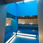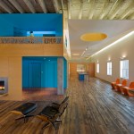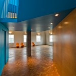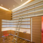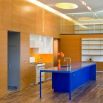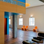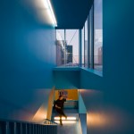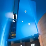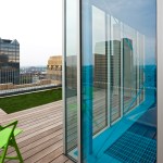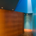 Located in an Art Deco hotel recently converted for private condominium use, we designed a penthouse apartment for a filmmaker with a roof deck overlooking the center of downtown Omaha. This apartment reinterprets the use of poché to create a cinematic architecture of sequence and frame. For the L-shaped unit we created a set of nested spaces with a grand room that appears as an exterior within the confines of the dense walls. 15-foot ceilings allowed the construction of a cozy mezzanine along the vertical path to the private roof deck above. Primary wood veneered walls hide bedrooms, house utilitarian areas, service functions and bathrooms. The wood has been CNC milled to form railings and light shields embedded within the walls. Recycled wood flooring and Douglas Fir wood ties contrast with the smooth wood veneer walls.
