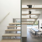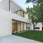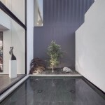 The entrance is shielded by a long, heavy, elevated wing wall that not only forms part of the ground floor and sideboard enclosure but also embraces an interior courtyard with an entry pond. This allows the east facade to be completely opened up over two stories while being visually almost inaccessible from the street.
