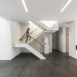 The material vocabulary of the project is reduced to three related elements. The extensive glazing, with its reflective and transparent surfaces and thin dark glazing frames, is starkly contrasted by white stucco facades. Wooden slats serve as a textural mediator through the use of parametrically generated undulation. Inside, material contrasts continue. Expressed through sharp-edged geometries and articulated datum, juxtapositions of white stucco, grey stone, and soft, warm wood surfaces unfold throughout.