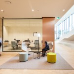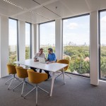 The building is an elegant composition of two volumes: the high-rise tower facing the Johan de Wittlaan and the low-rise plinth on the park side. The rhythm of pure white composite facade elements gives the building a timeless, classic beauty. The windows are subtly tilted either horizontally or vertically, thereby reflecting both the sky and the surrounding landscape.Inside, visitors are welcomed into a spacious, double height lobby. From the lobby, there is a gradual transition from open spaces to more private areas. A wide staircase, overlooking the dune landscape, descends to the conference centre. The higher levels feature a contemporary office environment that encourages cooperation.
