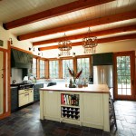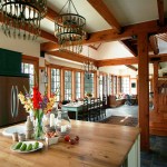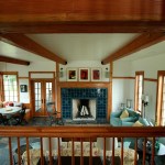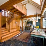 Stone floors lend a time-worn patina to the home. Goulette and his wife are salvage hounds and had been collecting pieces long before the house broke ground. “Stuff that’s been around for a while and doesn’t look all new and perfect” is how Goulette describes the appeal of croquet balls used on newel posts, an oak and tile fireplace surround, and Douglas fir timber beams from an 1890 mattress factory in Ontario.