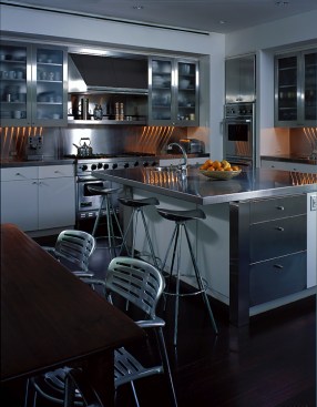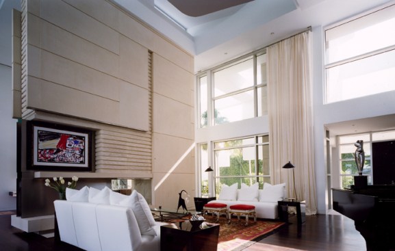 This modern home, of 9000 square feet, is located in an affluent, waterfront community. While there were no unusual programmatic requirements, the client wanted to achieve a sense of drama in the architecture and interiors; most importantly to capture the panoramic views. The house emerged as two slender volumes that oriented themselves perpendicular to the primary viewing plane. A double height space connects these two parallel wings. The connecting volume acts as the entry in to the formal living room and dining room, featuring full height glass fenestrations, in both the front and the back. Walking through the front entry you are afforded with a view straight through the center of the home to the Atlantic Ocean. The transparency provides welcoming views of the ocean from almost every point within the space. In addition, it allows for a clear perception of the two wings, which appear to be slipping out towards the water, framing the landscape. The structure rests as an imposing white beacon on the shore line. A poured concrete structural system with cinder block infill provided a stable base for an exterior stucco finish. From a massing point of view, the house is seen as a manipulation of pristine white planes and volumes that are layered in an effort to blur the true confines of the house and create a larger sense of dwelling. The interior material selections sought to maintain a cool, light toned and low contrast extension of the exterior walls. These vertical surfaces were used as natural light reflectors, filling the house with soft ambient light. Materials, such as the sandy hued limestone of the central fireplace element, the dark metallic textures of the stair system and the Brazilian Mahogany floor combine with the bright white walls to present a balance between cool and warm surfaces, as well as a visually compelling architectural experience.