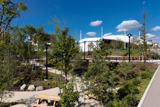 Though the endeavor to revamp this forgotten strip of the boardwalk did not stop at the restaurant restoration and creation of a concert venue. The design team took the lot adjacent to the new amphitheater and designed a public park. The idea was to have much needed greenery by the ocean. Textile roofs in the design allow for shade in the summer while hills allow visitors to look down onto the beach.