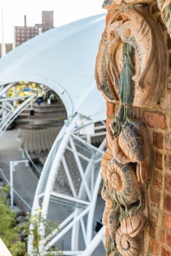 The Childs restaurant was to be restored to its former Spanish Colonial Revival structure as the building is a landmark structure. The architect and preservationist were commissioned to restore the palatial facade, which is framed with over 500 pieces of terra cotta of various colors. The designs include seashell ornamentation, wide-mouthed smiling fish, and Neptune sculptures.