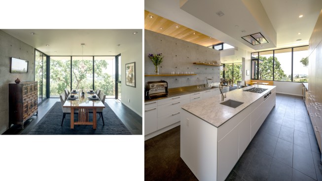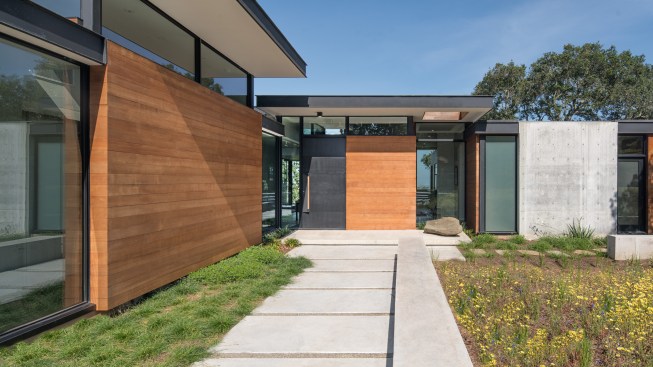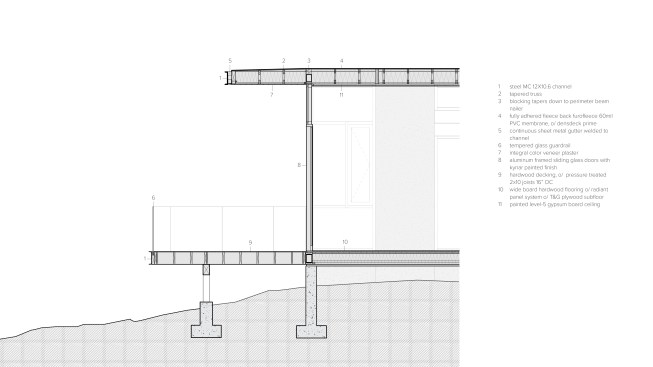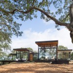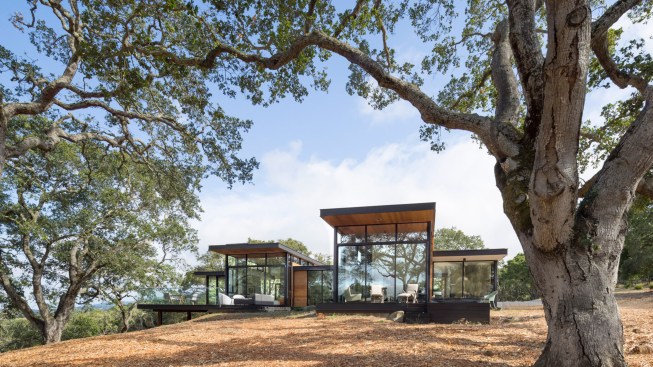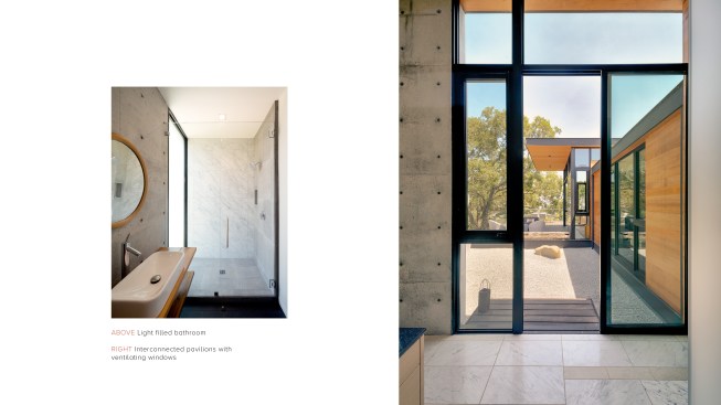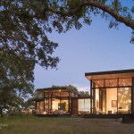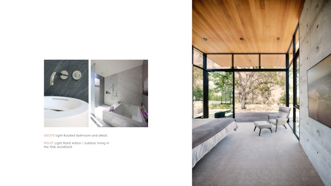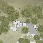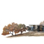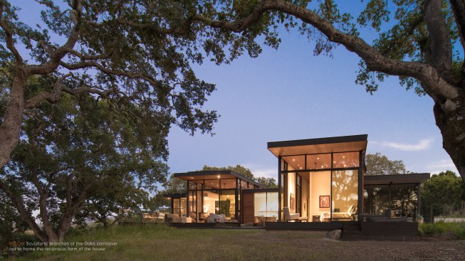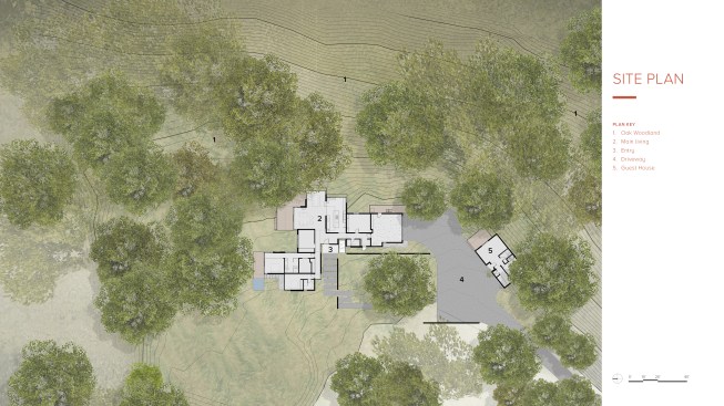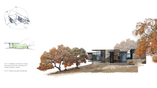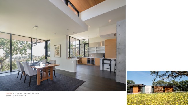 As public debate continues there rises a need to address the crucial question: How can California’s oaks and oak communities be maintained and enhanced over the next 50, 100, or even 200 years? Oaks of California, Cachuma Press 2014 In this context, the Portola Valley site mapped 41 specimen oaks, which together formed part of a larger oak woodland ecology that extends in patches along California’s coastal ranges. The higher goal of the project was to bring into focus the role that architecture can play in understanding and preserving California’s Oaks. By creating a direct dialogue between the spaces of the residence and the canopies of the trees, the design aims to elevate the owner’s experience of living with the trees, and implicitly offer a model for how to inhabit the Oak woodland. The architectural response began by carefully mapping the trunks, primary branches, and canopies of the trees relative to the topography and movement of the sun and breezes. The design concept creates a family of interconnected pavilions within the pockets formed by the clusters of mature trees. The architectural language begins with a spatial idea of using long extended overhanging roof lines in conjunction with the extended lateral branches of the trees to create outdoor rooms that are part building, part nature. Using the smaller footprints and extended roof lines of the pavilions, we were able to achieve a very high level of dexterity with the orientation of the pavilions and overhangs. This allowed us to use the spaces between the oak canopies to create living spaces, while optimizing orientation to sun and wind. The architectural vocabulary of the house is based on the repeating form of two parallel concrete “trunk” walls, which hold a cantilevering roof that extends past the walls on either side. The glass envelope is deeply recessed from the edge of the roof and configured to allow unobstructed access along its front edge, while providing operable windows that capture prevailing breezes along each of its short ends. Rooms are configured as interconnected pavilions that nestle between the mature trees and hover slightly above the interspersed grasslands. Windows are strategically placed to frame views of the sculptural form of the trees and valley beyond. The material palettes is minimal and comprised of fair faced concrete, vertical grain cedar, and steel. The vertical concrete walls disappear into the ground and reappear as horizontal landscape walls which extend beyond the building, cutting delicate lines into the grassland and anchoring the house to the hillside. We began seeing the architecture as a way of learning from the existing oaks. Not by mimicking them, but rather by connecting our well-being to theirs. By using the trees to guide our decisions we were able to cultivate a symbiotic relationship that allows the oak woodland ecology to thrive, while providing a privileged and unique living environment in nature.