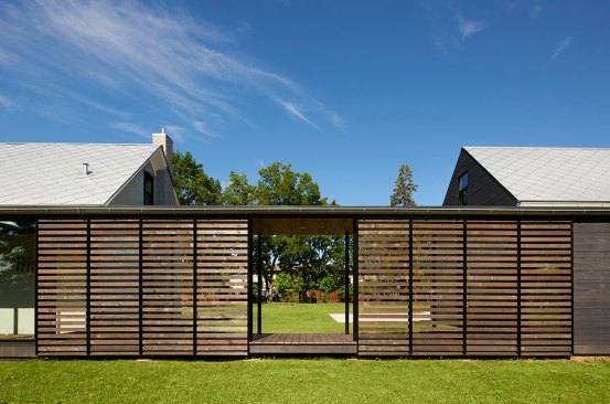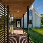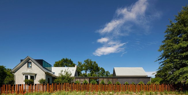Over the years, well-intentioned accretions—ornamental dormers, an incongruous addition, and a cavernous porch—had cloaked the house in a dog’s dinner. Demolishing these elements yields tailored alterations that sympathetically update the house for modern use. A weathered steel fence demarcates the property, its encircled lawn providing a sanctuary of stone paths and shade trees. Although housing developments have replaced the fields beyond, the homestead still strikes a commanding air.