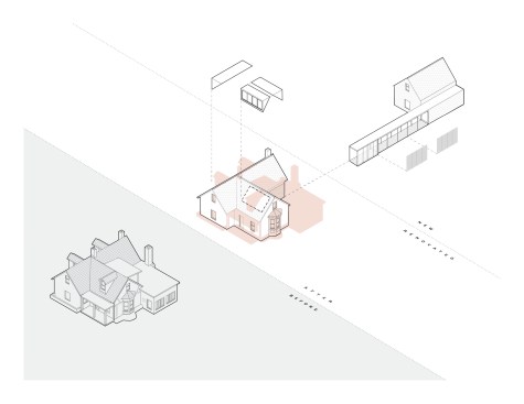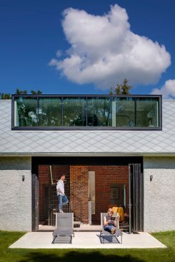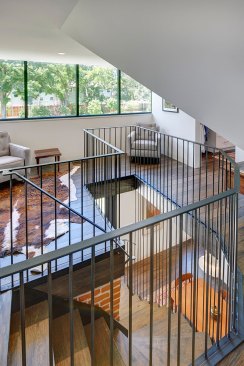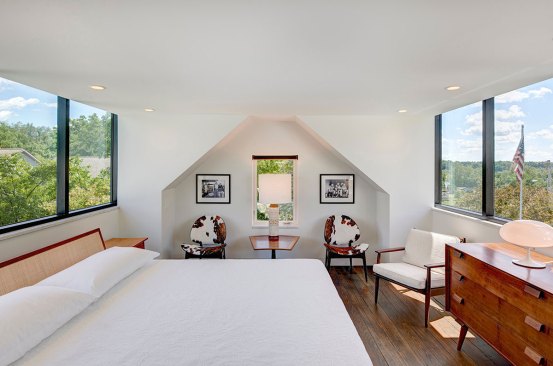The stair provides access to the bedroom suite above, tucked within existing roof geometries. Fully-glazed dormers provide essential headroom, bathing the attic in light and framing views of trees and sky. The intimate suite includes a bedroom, bathroom, and laundry/closet.