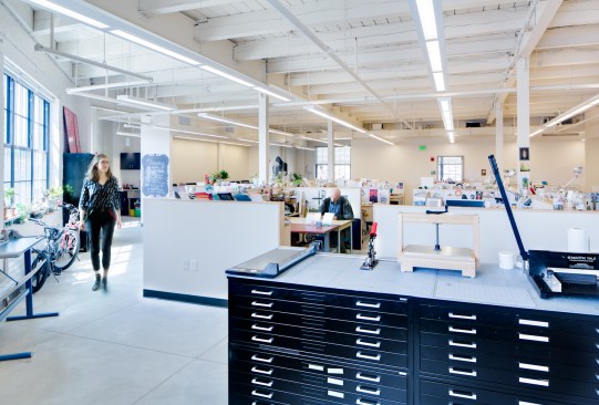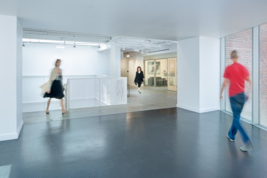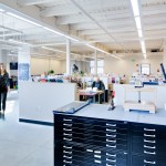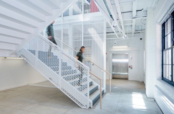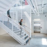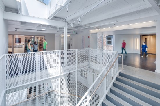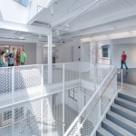 The building was originally designed to accommodate the curvature of a rail track into the building and resulted in a complicated fabric of existing spaces with an irregular column grid. Core elements and circulation are anchored in the center of the building, allowing irregularities along the perimeter walls. The design uses simple and clean masses to clearly distinguish modern interventions from the existing historic fabric. A new monumental skylight is introduced above the visually dramatic new circulating stair to bring natural light into the core of the building and interior glazing is used along the main corridors to allow the natural light to filter into the individual departments. The renovated space is celebrated by its occupants for the quality of light and clarity of circulation and how both help to create collaborative and productive working environments.