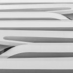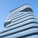 The advantages of the sinuous façade material is the efficient and ease of installation; the panels measure at up to four meters and despite the size, they can be reused. A system of adjustable metallic connections allows the complex forms to align easily. Being the first new construction in this neighborhood, the building attempts to combine the many existing and new diverse elements through movement to produce a play of light and shadow of the surroundings. Deep balconies are carved around the perimeter of the scheme in hopes to reduce solar gain in the interior spaces and simultaneously allowing larger portions of glass to be used without sacrificing passive climate controlled spaces.