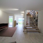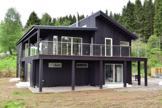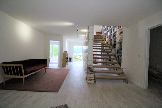 The house has been designed with the living quarters upstairs and a large covered surrounding balcony, to maximise the site’s outstanding 1,000ft views. The interior is constructed around a framework of a large, wide, open tread staircase and double height floor to ceiling shelving to incorporate the client’s extensive collection of 10,000 books.