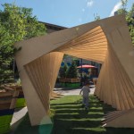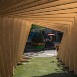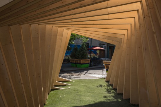 The park’s name is reflected in the composition of the gateway structures. The parametric design, comprised of sequential rotating squares, creates a dynamic effect that draws people into the park. Twenty-one independently constructed ribs rotate over a 30-degree axis. A stunning optical illusion of a shrinking tunnel visually appears because the inside square rotates at a different degree than the outside square. The gateways were installed in one afternoon and were only meant to be on public display for two months; however, the city has already received several requests for the gateways to be relocated to other local parks once the pop-up park closes.