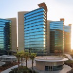 Set in a landscape of winding paths, local plantings, and sunken terraced gardens that bring greenery and daylight to the underground parking area, the mixed-use enclave comprises six high-rise office towers, four mid-rise office buildings surrounding a versatile business center, and 12 duplex townhouse-style residential buildings. Each building type is distinct but unified by a contemporary design sensibility. Open plans are complemented by a material palette of light-colored stone and blue glass that echo the sand and sky.