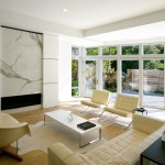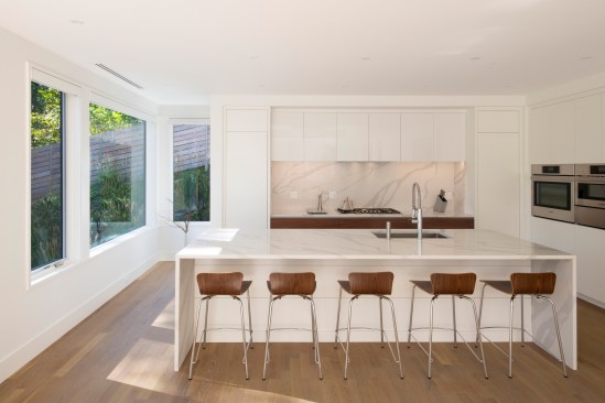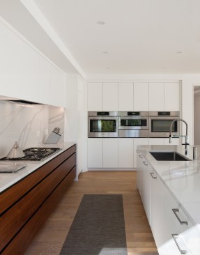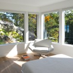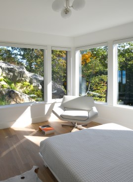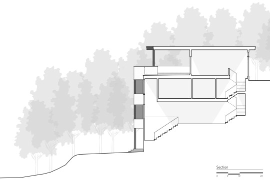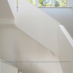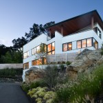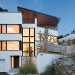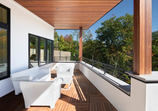 A common constrain of creating a site specific spec house is developing a great design within the budget and time constraints that define this project type. An additional challenge consisted of terracing the house is into a granite outcropping, which limits natural light and windows primarily to the front facade and roof. Within a compact footprint, the house is spacious. It contains, in addition to an open plan living area, five bedrooms. The sloping site required dividing the program between four levels. The interior layout is focused on livability and comfort. The main living spaces, on the second level, are scaled to establish a sense of intimacy when occupied by one or two people but can simultaneously accommodate larger groups. The living room, dining room, and kitchen are all open to each other but each has its own sense of place. The deliberate omission of separate formal spaces allows the bedrooms of the third level to communicate directly to the living spaces below. A broad open stairway serves as both a light well and a vertical street. Surrounded by more traditional capes and ranches, along with the occasional Victorian, the simplicity and disciplined nature of the project's exterior complements rather than conforms to its architectural context. The exterior configuration of windows balance light and transparency with a tactile sense of solidity and security. Set back from the street and screened by mature trees, the visual impact of the volume and height of the house are reduced in scale by the subdividing its mass down into smaller, terracing elements. The abstract nature of the stucco-clad exterior is offset by the richness and mystery of the loggia above.