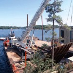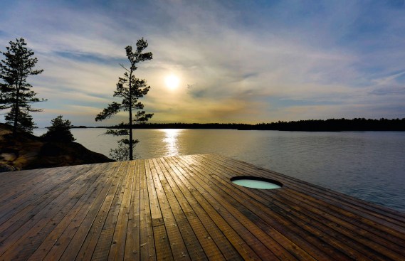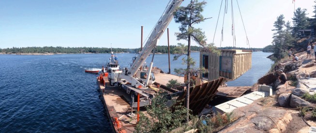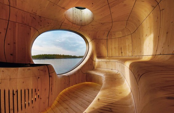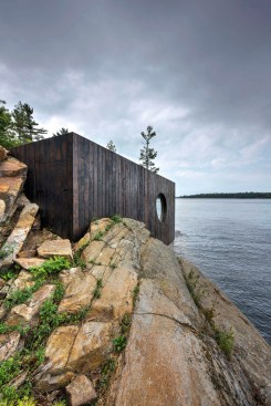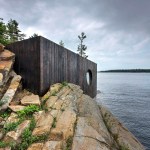 The Grotto Sauna near Parry Sound, Ontario, Canada, drew inspiration from the historical definition of a grotto – a secret water filled cave, concealed within unexpected rock formations. Perched on a private island in Lake Huron, the OAA Design Excellence Award nominated building is embedded in the ancient rock formation, the Canadian Shield, which forms the backbone of North America. The sculpted space compliments and becomes part of the prehistoric landmark. Challenging the standards of current practices in the construction industry, every detail was communicated with a millwork and steel fabrication partner. Together, a new process of fabrication was developed, utilizing state of the art 3D technology to scan, model and build the Grotto, so that the building would sit naturally in the rock formation. To complement the surreal environment, PARTISANS decided on a simple, burnt Red Cedar exterior. In contrast, the curved White Cedar interior helps optimize air flow. The Grotto requires two high performance ovens. Insulation was needed not only to protect its components from heating or cooling too quickly, but also to make the Grotto energy efficient. The space behind the wood panels creates convection currents that allow the skin to breathe through the ventilation pores that were carved into seats and seams of the cedar panels. Pouring water on the oven creates steam that makes the humidity within the structure jolt up in short, extreme bursts. DELTA®-FASSADE S has high vapor permeability, allowing for the moisture vapor that accumulates inside to escape. On the exterior, it acts as a durable drainage plane, channeling water from wind-driven rain and snow to the outside of the structure. The watertight membrane helps protect the building enclosure from damaging effects of moisture infiltration. When PARTISANS met on site, they knew that their most prominent challenge was to make a free-standing structure that respected and complimented the environment. Understanding the rock formation was the first step in construction. After examination of the setting, it was determined that the best course of action was to prefabricate the building and deliver it to the site by barge and crane.