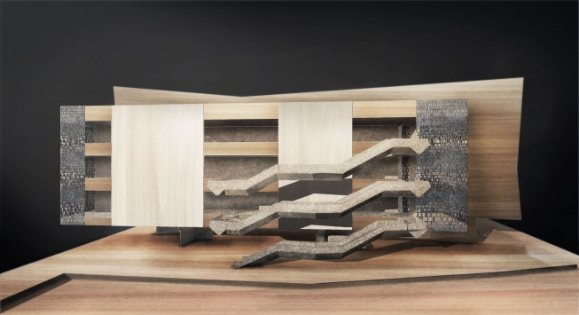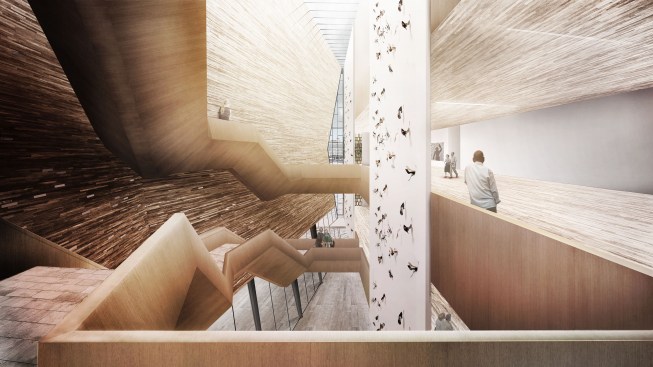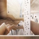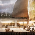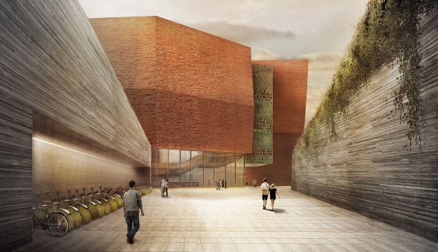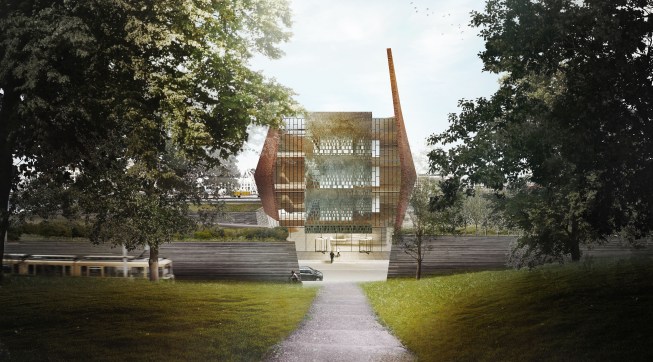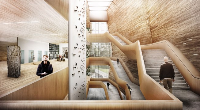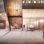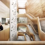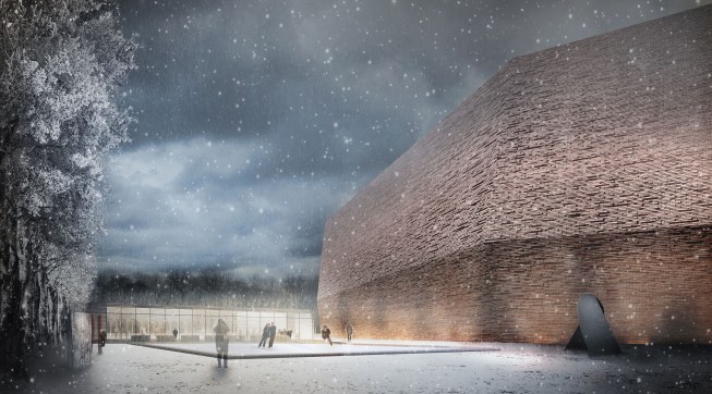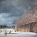 Long clay bricks in a pronounced pattern are embedded into an array of precast panels to create both a unique geometry for the building skin, as well as an undulating material surface that uniquely evokes a strong Nordic masonry influence. The pattern is frequently broken to create an opportunity for light to enter the interior, where this masonry pattern is mirrored with a configuration of stacked wood. This object is offset from a plinth of concrete, landscape, and stone that organizes and cloaks the existing transportation networks, allowing for an array of public uses.