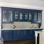 This custom home was developed for the homeowner to create a laid-back, East coast feel. Thoughtfully placed on the site, the trees provide a frame to capture the Hampton’s style as if it had been there for years. The timeless quality of the shingle and brick exterior blend into the interior finishes and furnishings where a more transitional approach was taken to blend the owner’s love of different styles. The layout of rooms open up to one another creating large sight lines that extend further on to the large front porch and outdoor living area made for entertaining. The entry herringbone floor pattern leads way to a wine room that becomes the jewel of the home with a viewing window from the dining room that displays a wine collection on a floating stone counter. The hub of the home includes the kitchen with midnight blue and white custom cabinets, a quaint banquette and an artful La Cornue range that are all highlighted with brass hardware. The kitchen connects to the living space with a cascading see-through fireplace that is surfaced with an undulating textural tile. Off the living area, the master suite highlights the custom bed integrated with reading sconces that enhances the tailored panelized walls and millwork. The master bath centers on the burnished silver Waterworks bathtub and axial book-matched floor slabs. The owner’s existing furnishings were reupholstered and transformed to reflect the casual yet tailored palette. Through architectural and interior development, the details of this custom home shine through on every surface.
