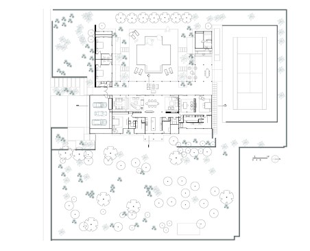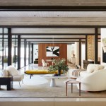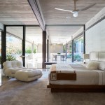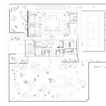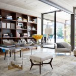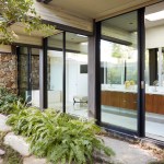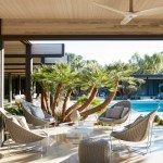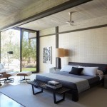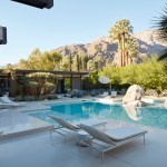 The house is configured on three sides around an exterior courtyard, with extensive outdoor spaces—it comprises a great room, kitchen, master suite, guest suite, massage room, sauna, outdoor bar area, and pool, with a tennis court adjacent to the complex. Buff & Henson were known for their skillful deployment of exposed post-and-beam construction and the Harvey House was no exception; Marmol Radziner chose to enhance the outline of the frame with new brown-black trim that contrasts with the original white.