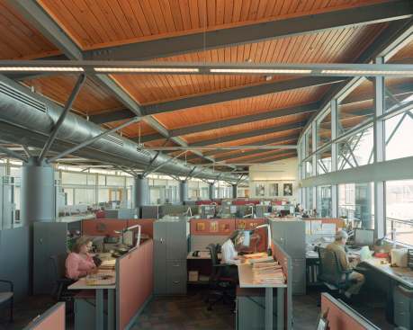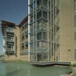 The ringed site physically expresses the ripple effect of passing on the gift, also initiating the Headquarters’ layered planning. Crafted to maximize sunlight and rainwater and avoid pollutants, the headquarters was designed to see a 55% energy saving over conventional buildings. Researching how Heifer builds animal shelters around the world uncovered a simple elegance in constructing just what is needed, leading to exposing all systems as part of an honest story that celebrates beauty in functional elements. A narrow 62′ floor width and east / west orientation enable natural light penetration to each floor’s center, giving all 472 employees light and views; most enjoy the best northern views to the River, Park, and Library. An inverted heavy timber roof directs rainwater through exposed collection piping to a tower for “gray water” reuse within the building. The water tower, wrapped with a stair in glass, forces water to move as people move, creating an iconic symbol for environmental stewardship. Even after ten years since its completion, the project continues to perform as intended and be a model for sustainable design.