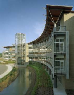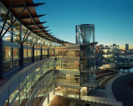 Taking advantage of placement next to the $150 million Clinton Presidential Library’s 30 acre park and river, property edges are intentionally blurred, positioning both projects in a combined 60 acre green belt. Our modestly budgeted $18 million, 95,000 sf building steps back like a shy friend, inviting all to utilize park amenities. Employees have biked, walked, carpool,ed and even canoe to work.