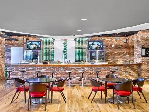 As primary interior architect, Spector Group consolidated Heineken from two locations into the company’s headquarters at 360 Hamilton Avenue in White Plains, New York. The project consisted of the redesign and expansion of Heineken’s bar and social zones, and the enhancement and densification of their existing 60,000-square-foot bi-level space. In an effort to encourage Heineken’s culture through architecture, Spector Group’s design involves an open plan with a variety of social hubs allowing for maximum employee interaction and engagement. Upon entering the space, employees and guests are greeted by a palette of simple raw materials, which are offset by modern design elements throughout the expansive bar, “insperience” hub and reception area. Designed for flexibility, these open areas cater to large events, training programs and other multi-use functions. The modern ceiling feature, large interactive digital screens and experiential bar design capture the brand’s forward-thinking and innovative culture.