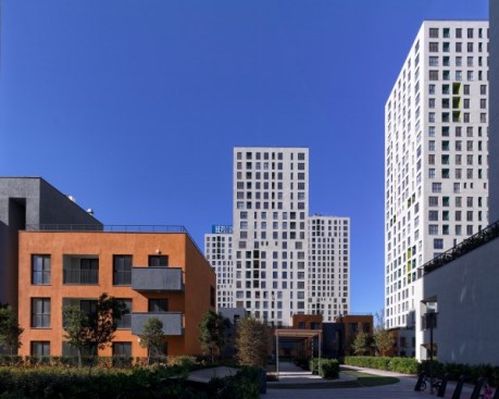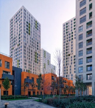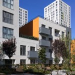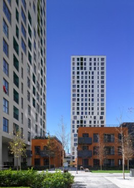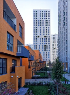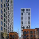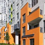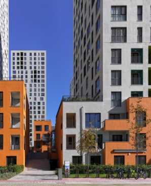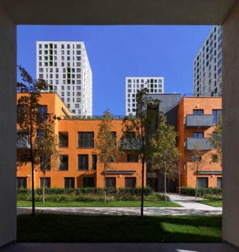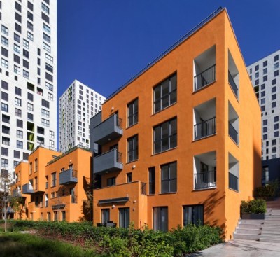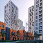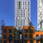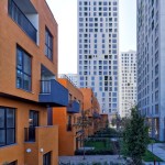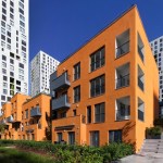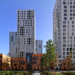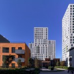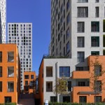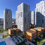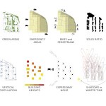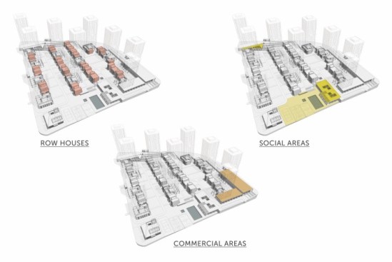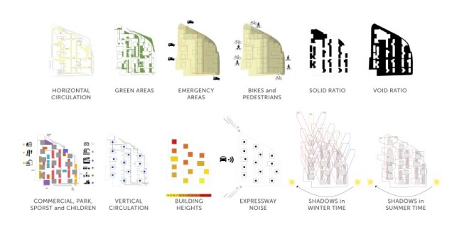 On 56.000 m² site area, the given maximum %40 lot coverage is only used as %28. The total foot print is tried to be reduced to allow maximum open and green space uses, courtyards. To obtain that low rise and high rise buildings are mixed. The high rises are diverted according to direction, shadow, wind and access point. The 25 storey is accepted as the effective limit both for construction/financial issues and comfort. The units, 1422 in total, are designed in a container logic with different sizes, and placed in various positions in a floor typology. This differentiation is also the main element for their facade design. The low rise row houses have also different heights allowing the roofs to be used as public roof gardens or terraces.
