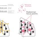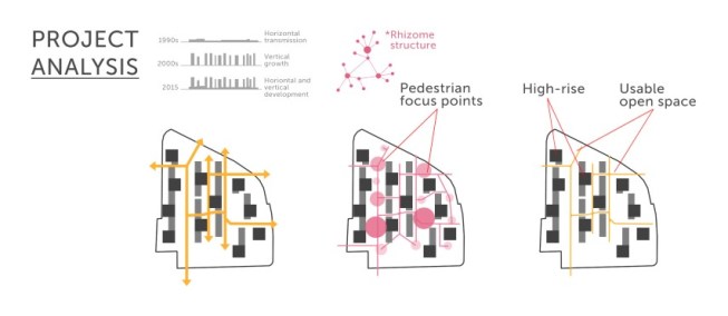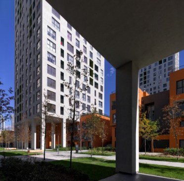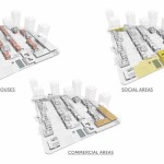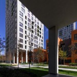 A “rhizomatic” spacial organisation is designated; no centres, with the attraction points all around. This led to create secondary passages, courtyards on different levels allowing the critical air flow. For the sun penetrate inside all the compound, the heights of the buildings aligned on the North-South axis decreases through east. West masses have different gauges blocking the negative effects of the highway and the West sun.