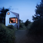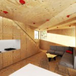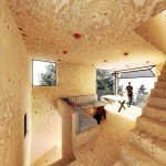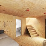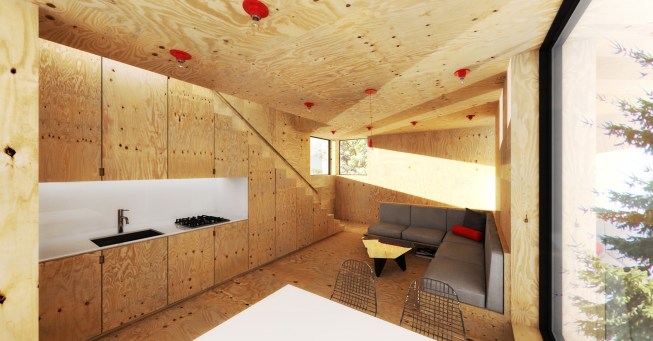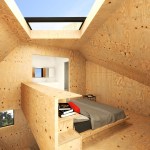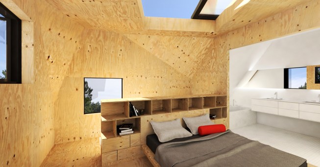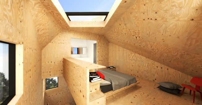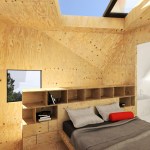 The project embraces its very tight budget with a minimal palette of plywood surfaces and millwork, standard manufactured windows, and inexpensive white standing-seam metal roofing that wraps the entire structure in abstract linework. Bare bulbs are fitted into $3 porcelain sockets, keeping the electrical budget low. An inexpensive acrylic dome skylight is mounted on rails, allowing it to roll open and offer the urban camper a night under the stars.