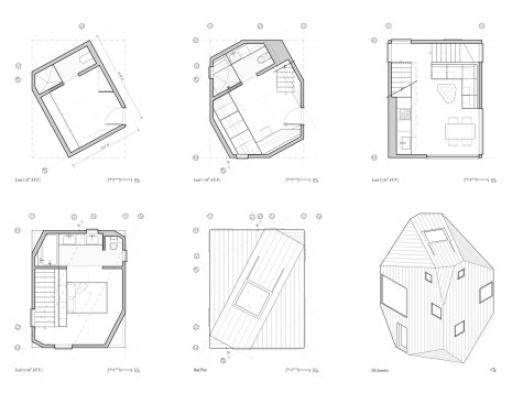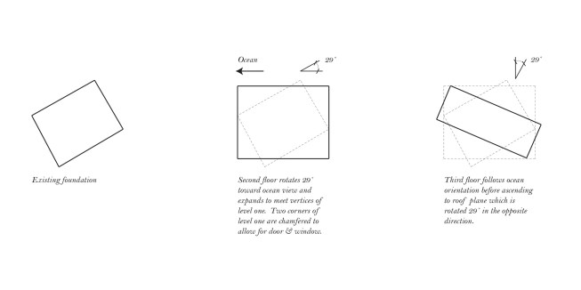 The design of Heptagon House takes advantage of the simple geometric properties of plan rotation in order to simultaneously expand the area of the upper floors and align the guest house toward an ocean view. Floor plates act as diaphragms stabilizing diagonally canted planes, allowing the project to be constructed using simple platform framing with inexpensive plywood sheathing as finish material throughout. The plan is chamfered twice at the floor plate and roof to allow for a front door and larger windows, yielding four heptagonal facades and a series of canted planes that opportunistically turn the local gabled roof vernacular on its head.