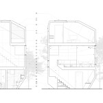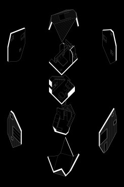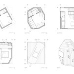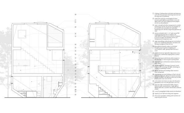 Heptagon House uses an opportunistic approach to underutilized spaces in order to fit a 2-bedroom, 2-bathroom guest house onto the tiny footprint. Spaces yielded above canted planes are used strategically by millwork and a shower bench in the bath, an elevated bed/lounge with storage in the bedroom/study, and a stair to the second floor that ascends the canted plane on an oblique.