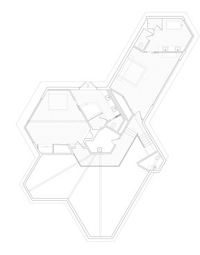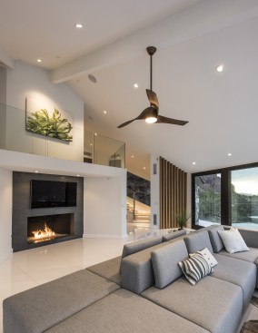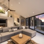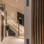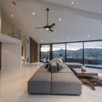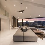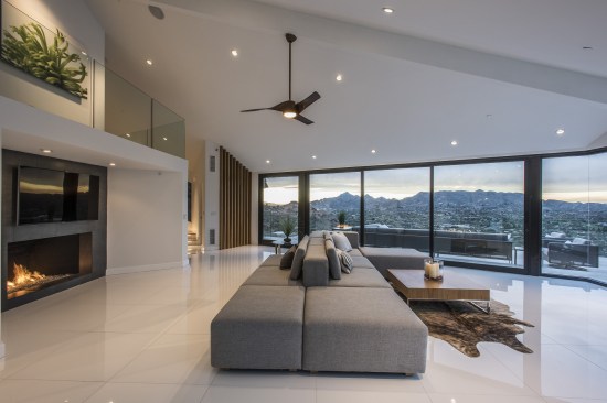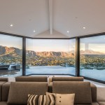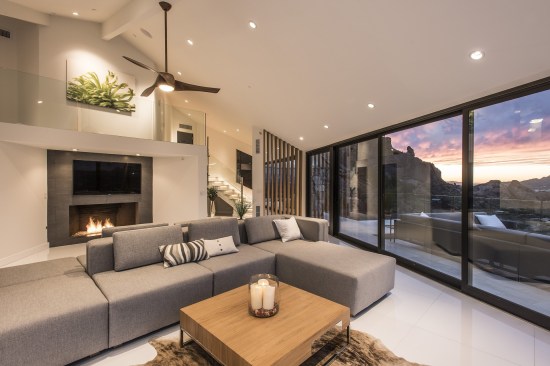 The house is one of the highest houses in Camelback Mountain and enjoys 210° spectacular, dynamic views sunrise to sunset. The interior was designed to achieve a relaxing atmosphere, with a neutral palette to enhance the views. The great room is notable for its triangular shaped layout, creating a focal point that guides the eyes towards the landscape. In the living room, independent windows and thick columns that used to block the view were converted into a single continuous panoramic view.
